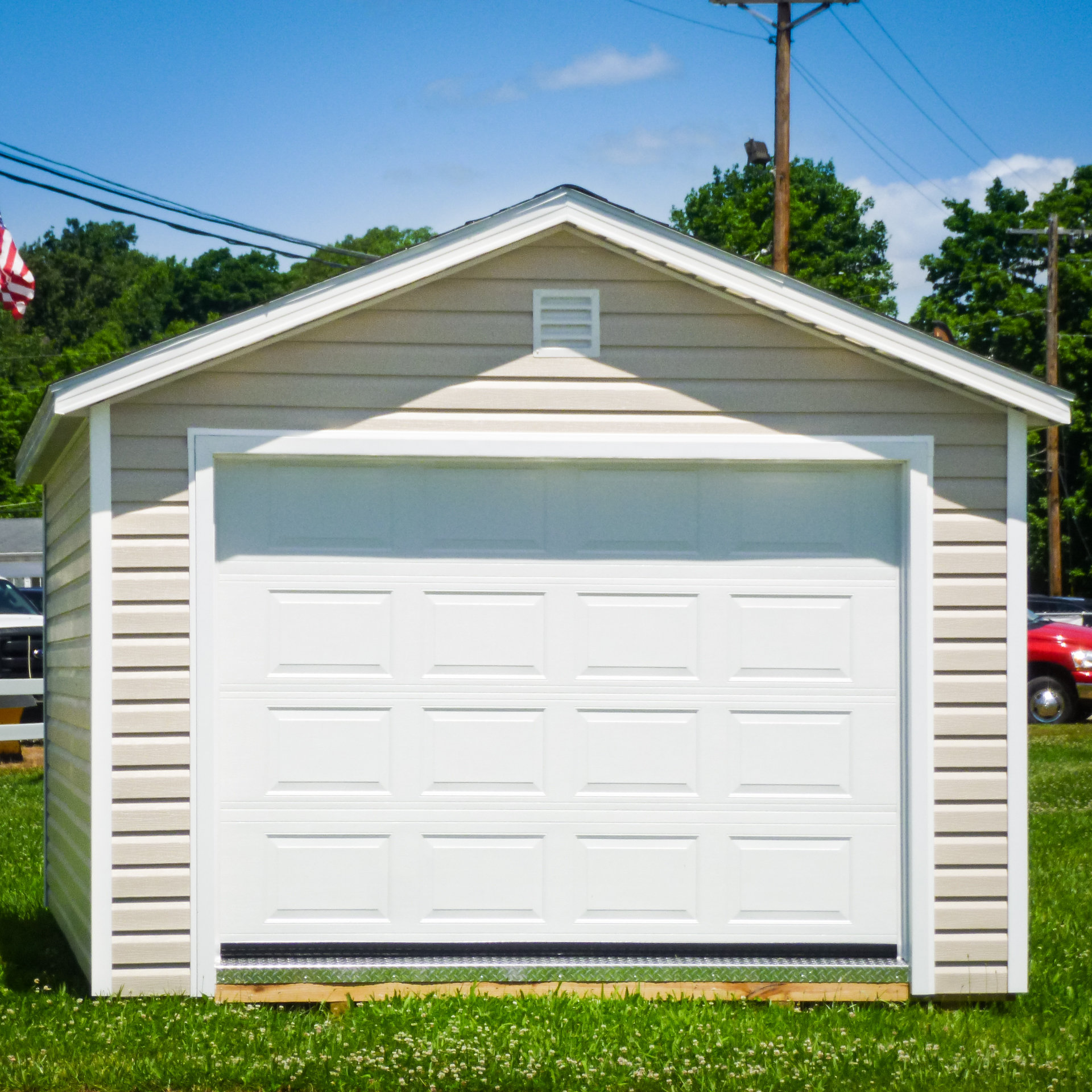 exterior of a-frame single-car garage size for sale
